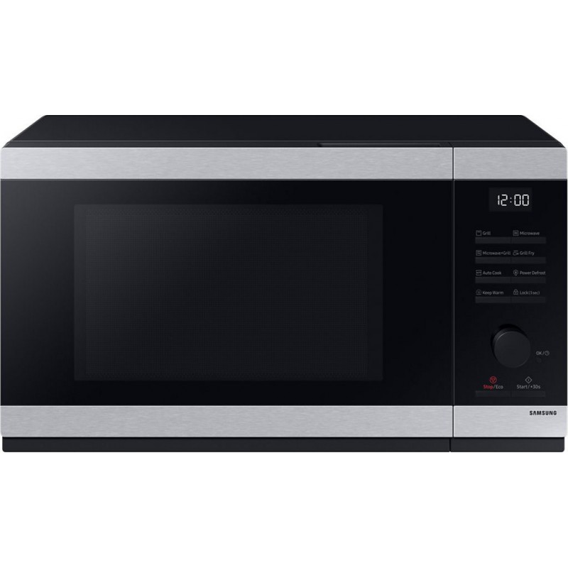 Micro-ondes Grill SAMSUNG MG32DG4524CT 32L: Performance et Design au Service de Votre Cuisine Un design moderne allié à une technologie de pointe Le micro-ondes grill SAMSUNG MG32DG4524CT se distingue par son design contemporain, avec une finition inox noire et une poignée cachée pour une ouverture aisée. Sa capacité de 32L et son plateau tournant de 31,8cm permettent de préparer de grands plats pour toute la famille. La cavité en céramique émail assure une résistance accrue à l&-39 usure et à l&-39 abrasion, tout en facilitant le nettoyage. Ce modèle intègre également une puissance restituée de 900W et six niveaux de puissance micro-ondes, garantissant des performances de cuisson optimales. Fonctionnalités innovantes pour une cuisine simplifiée Le micro-ondes MG32DG4524CT offre une expérience utilisateur intuitive grâce à son contrôle électronique simplifié et son bouton de commande précis. Avec ses 8 programmes automatiques, dont la fonction Power Defrost pour une décongélation rapide et homogène, et Gril Fry pour des plats croustillants, ce micro-ondes répond à tous vos besoins. La fonction maintien au chaud, la désodorisation et le mode Eco sont autant de caractéristiques pensées pour votre confort. De plus, la sécurité est assurée par la protection enfant, rendant cet appareil idéal pour les foyers avec de jeunes enfants. Produit neuf dans son emballage d'origine bénéficiant de la garantie originale du fabricant. EAN 8806095506906.