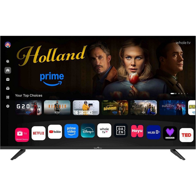 Smart Tech TV 43&-34 (108cm) – Une Smart TV Performante Découvrez la Smart Tech TV 43&-34, une télévision connectée qui allie praticité, qualité d’image et accès simplifié à vos contenus préférés grâce à Whale OS. Plongez dans l’image 4K QLED Profitez d’un écran de 43″ (108cm) avec résolution UHD 3840×2160 px et dalle QLED: des couleurs éclatantes, un contraste puissant (3000:1) et des angles de vision larges pour une immersion maximale. Smart TV Whale OS – Une interface fluide et intuitive qui vous permet d’accéder rapidement à vos contenus. Applications préinstallées – Profitez instantanément de Netflix, YouTube et Prime Video, prêts à être utilisés dès l’allumage. Son équilibré – Avec 2 haut-parleurs de 8W Dolby Digital , bénéficiez d’un son clair et immersif pour un meilleur confort d’écoute. Connectivité complète – Branchez et connectez facilement vos appareils avec 3 ports HDMI, 2 ports USB, un port Ethernet, le Wi-Fi et une sortie optique. Produit neuf dans son emballage d'origine bénéficiant de la garantie originale du fabricant. EAN 5999862972233.